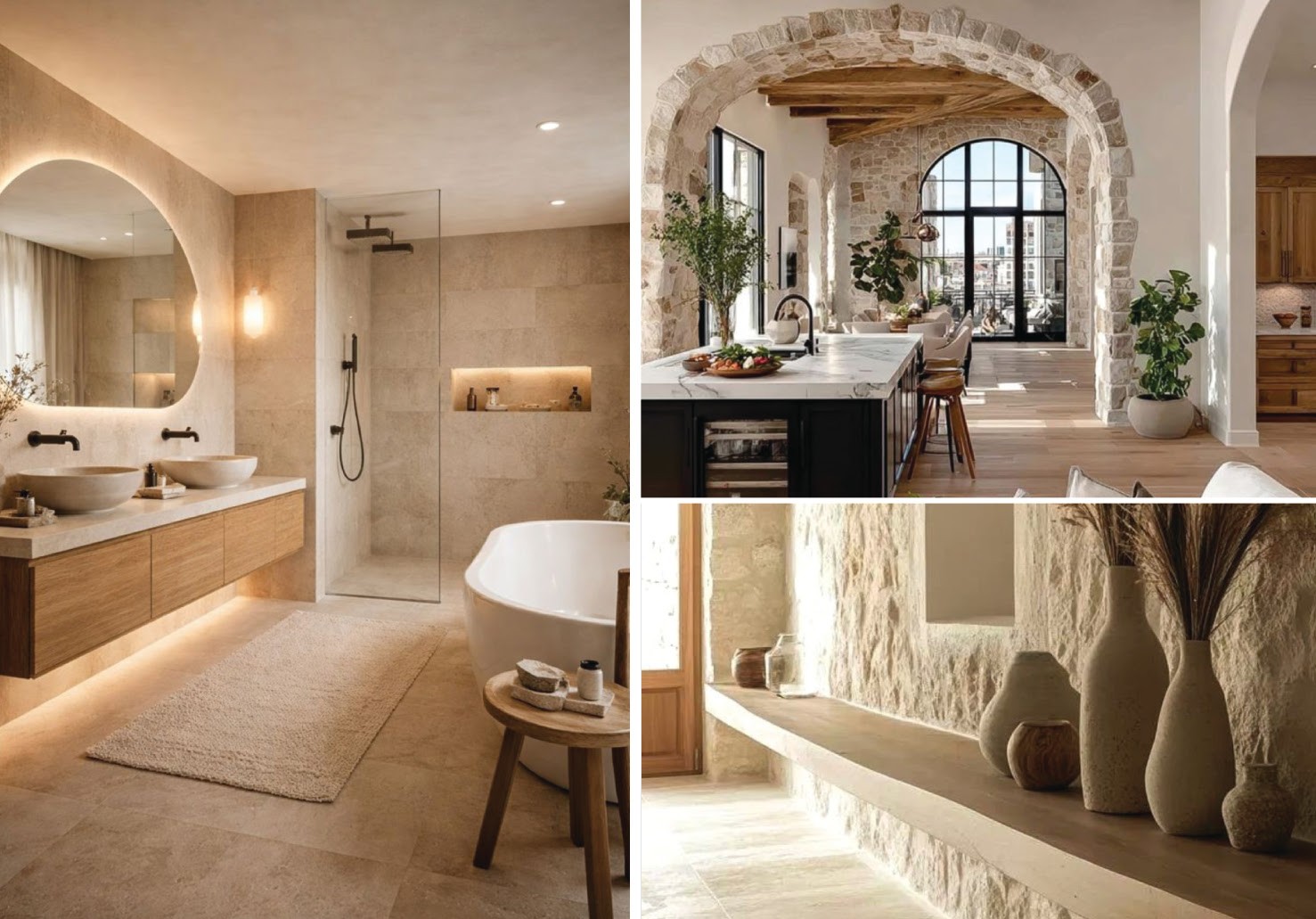 The third style centers on texture and dramatic surfaces. I am seeing more natural stone, marble, and richly textured materials being used together, and I love the depth this creates. Texture adds warmth you can feel, not just see. The trick is to avoid going too heavy.